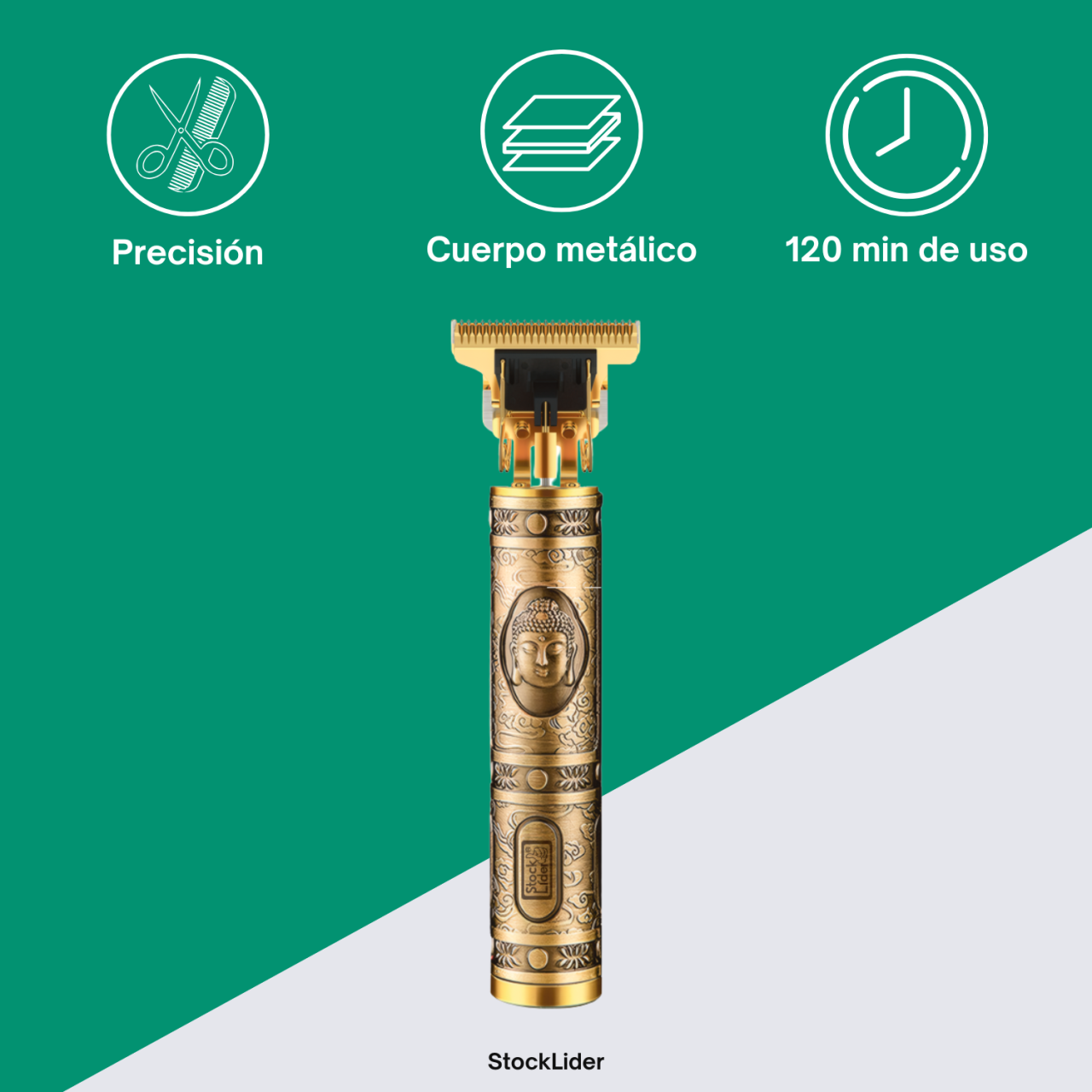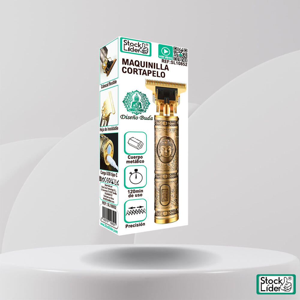 Cortapelo profesional con cuerpo metálico dorado y grabados estilo Buda. Cuchillas de acero inoxidable de alta precisión para degradados fade y diseños detallados. Batería litio 120 minutos y carga rápida USB Tipo C.
